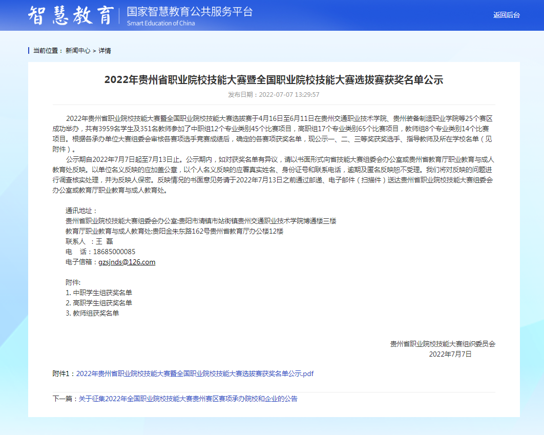 On July 7, the good news came from the selection of the 2022 Guizhou Vocational College Skills Competition and National Vocational College Skills Competition. The Organizing Committee of Guizhou Vocational College Skills Competition officially released the List of Winners of Guizhou Vocational College Skills Competition and National Vocational College Skills Competition 2022. Our school has won a total of 43 prizes, including 7 first prizes, 19 second prizes and 17 third prizes.