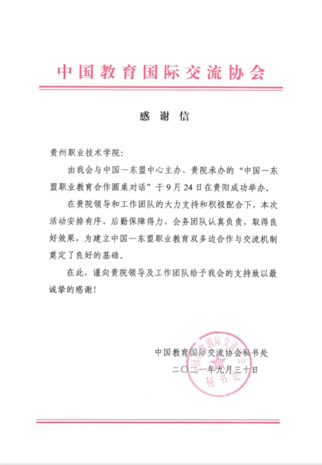 Recently, our school has received a letter of thanks from China Education Association for International Exchange, highly praising our school's ability in arranging the conference, providing logistics, organizing conference affairs and the teamwork for the "China-ASEAN Vocational Education Cooperation Roundtable Dialogue", which fully affirms our school's achievements.