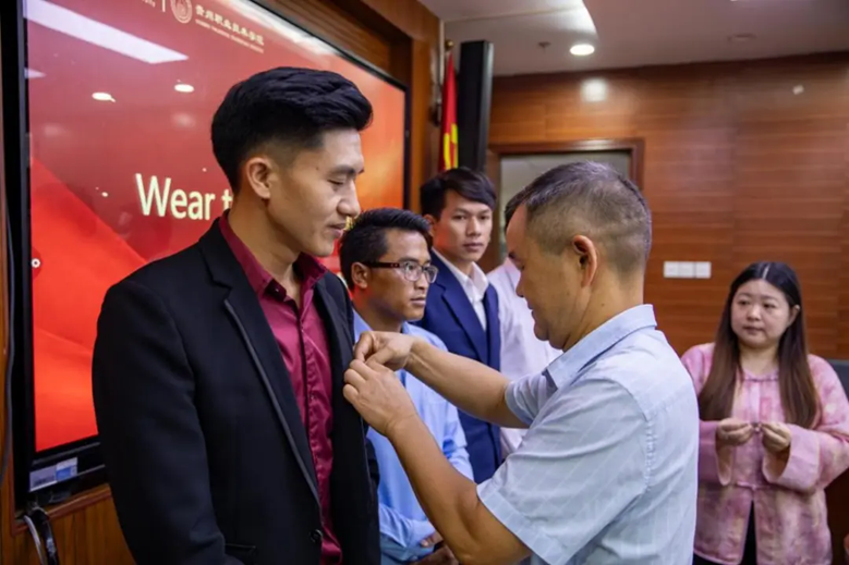 Finally, Lin Changsong presented the university badges to the students and announced the official opening of the program class. The launch of this project marks a solid step taken by the university in promoting the internationalization of “Chinese Language + Vocational Skills” talent cultivation and deepening educational cooperation between China and Laos, injecting educational strength from Guizhou into the construction of a community with a shared future between China and Laos.