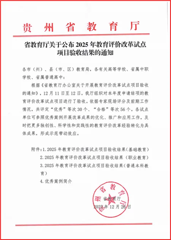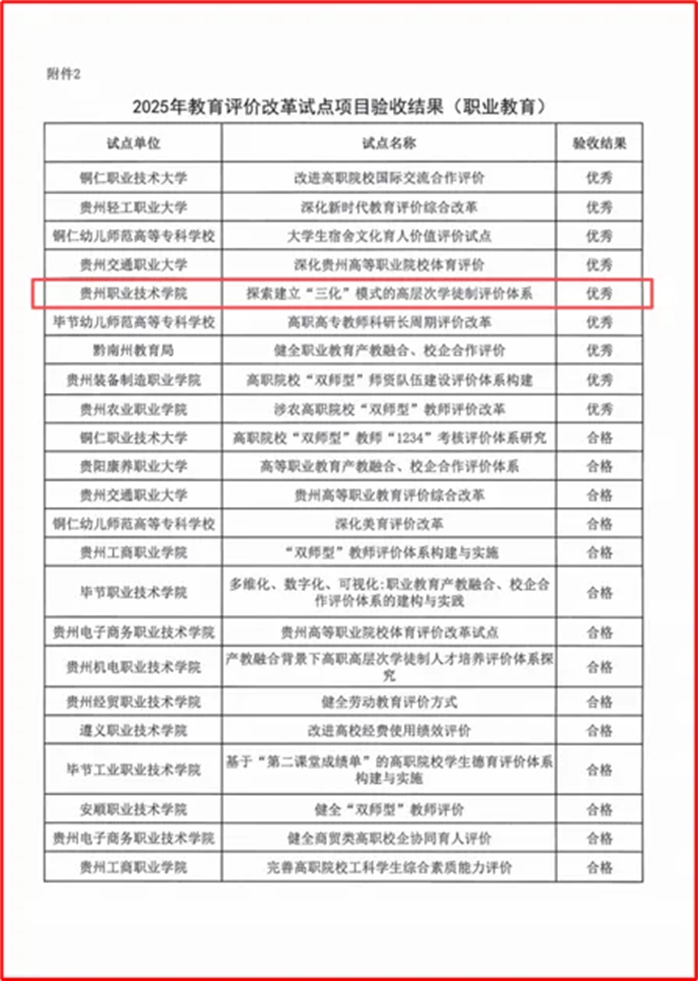 The results of the provincial inspection of the education evaluation reform pilot projects in Guizhou Province have been announced. Our university’s project, “Exploring the Establishment of a ‘Three-ization’ Model for the Evaluation System of High-level Apprenticeship”, has been rated as “Outstanding”, becoming one of the nine projects among the 26 participating vocational colleges in the province to receive this honor. This marks a breakthrough in our university’s efforts in the field of education evaluation reform.
